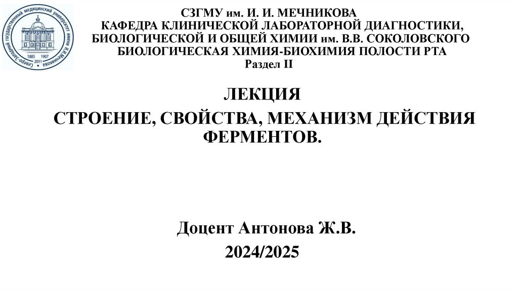 1. СЗГМУ им. И. И. МЕЧНИКОВА КАФЕДРА КЛИНИЧЕСКОЙ ЛАБОРАТОРНОЙ ДИАГНОСТИКИ, БИОЛОГИЧЕСКОЙ И ОБЩЕЙ ХИМИИ им. В.В. СОКОЛОВСКОГО
