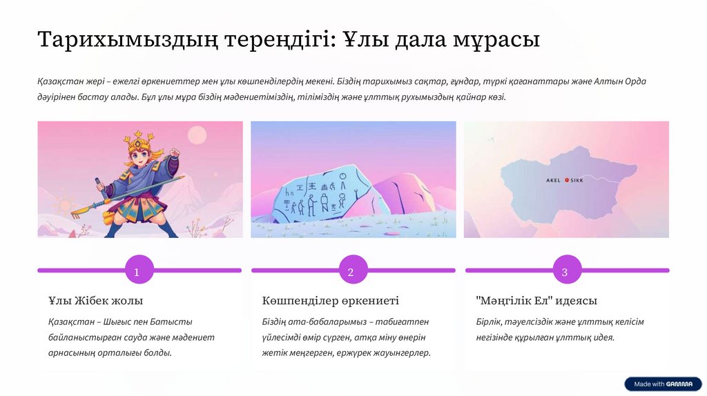 Тарихымыздың тереңдігі: Ұлы дала мұрасыҚазақстан жері – ежелгі өркениеттер мен ұлы көшпенділердің мекені. Біздің тарихымыз сақтар, ғұндар, түркі қағанаттары және Алтын Орда