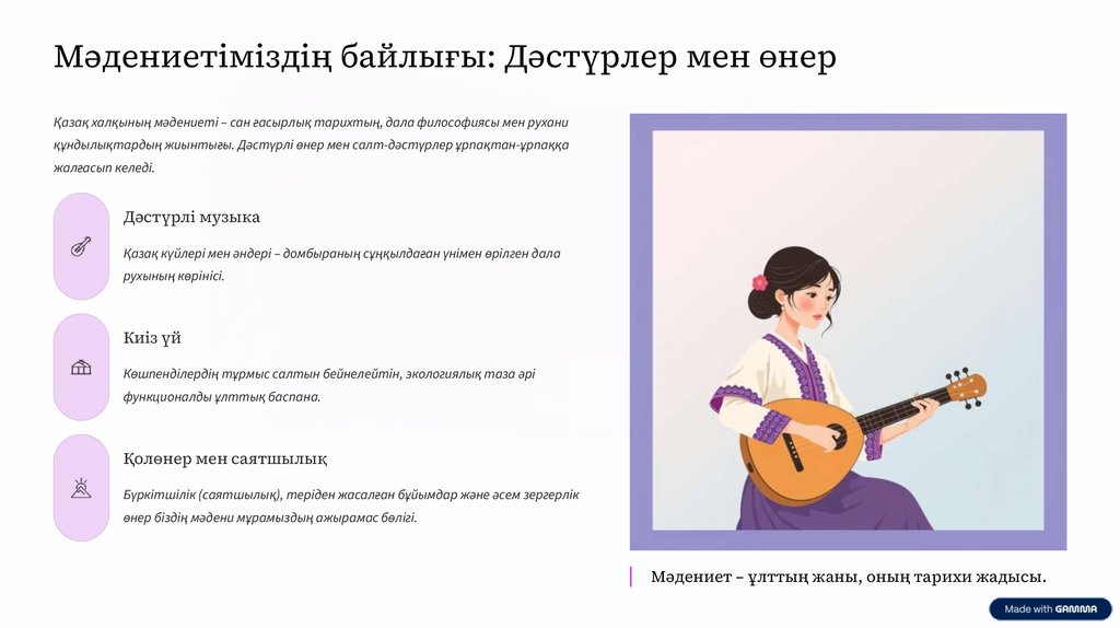 Мәдениетіміздің байлығы: Дәстүрлер мен өнерҚазақ халқының мәдениеті – сан ғасырлық тарихтың, дала философиясы мен рухани