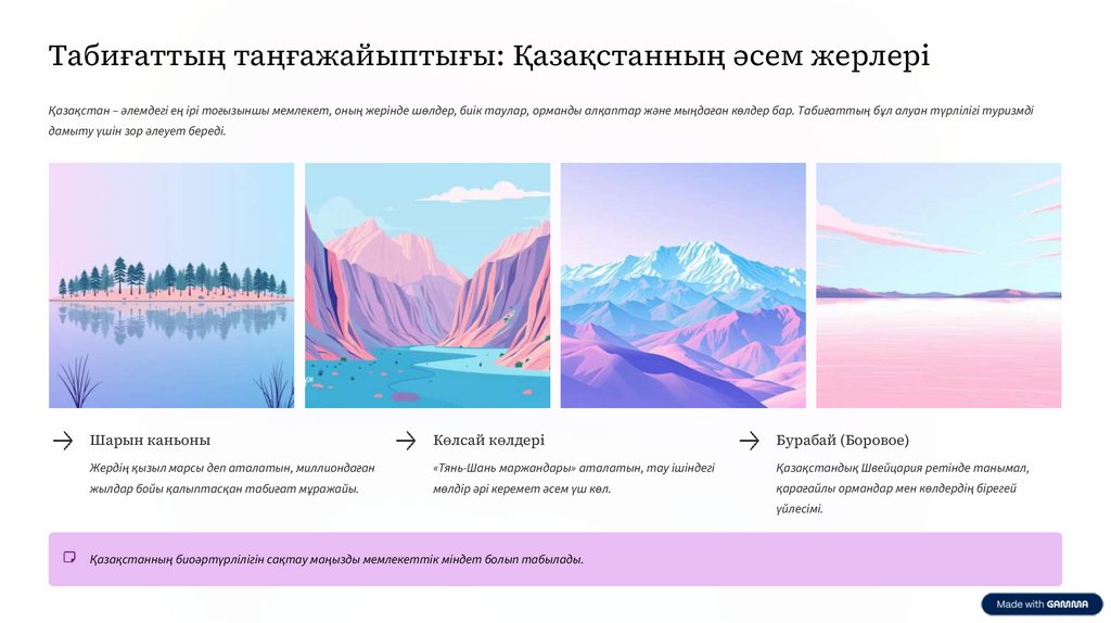 Табиғаттың таңғажайыптығы: Қазақстанның әсем жерлеріҚазақстан – әлемдегі ең ірі тоғызыншы мемлекет, оның жерінде шөлдер, биік таулар, орманды алқаптар және мыңдаған көлдер бар. Табиғаттың бұл алуан түрлілігі туризмді