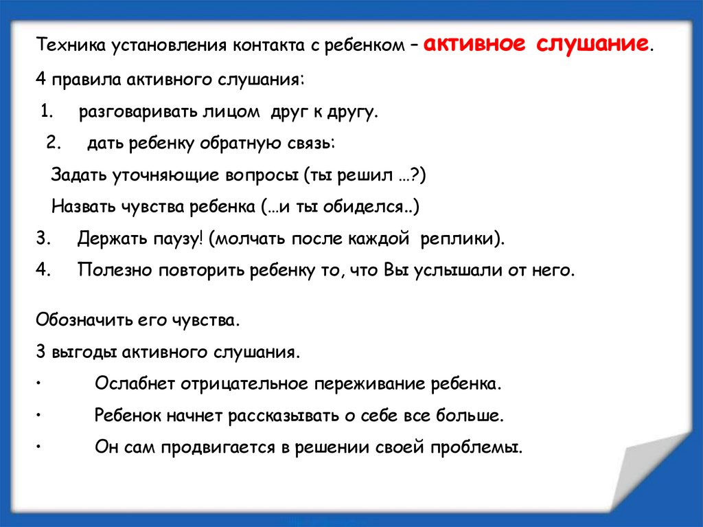 Техника установления контакта с ребенком – активное слушание.4 правила активного слушания: