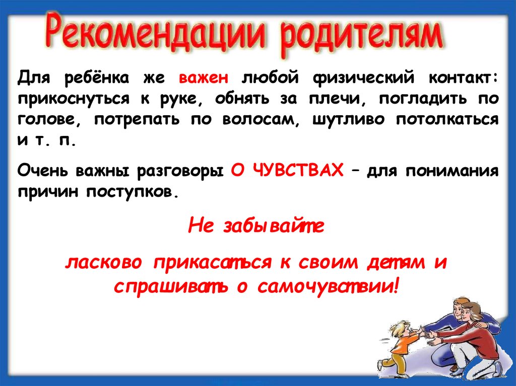 Для ребёнка же важен любой физический контакт:прикоснуться к руке, обнять за плечи, погладить по