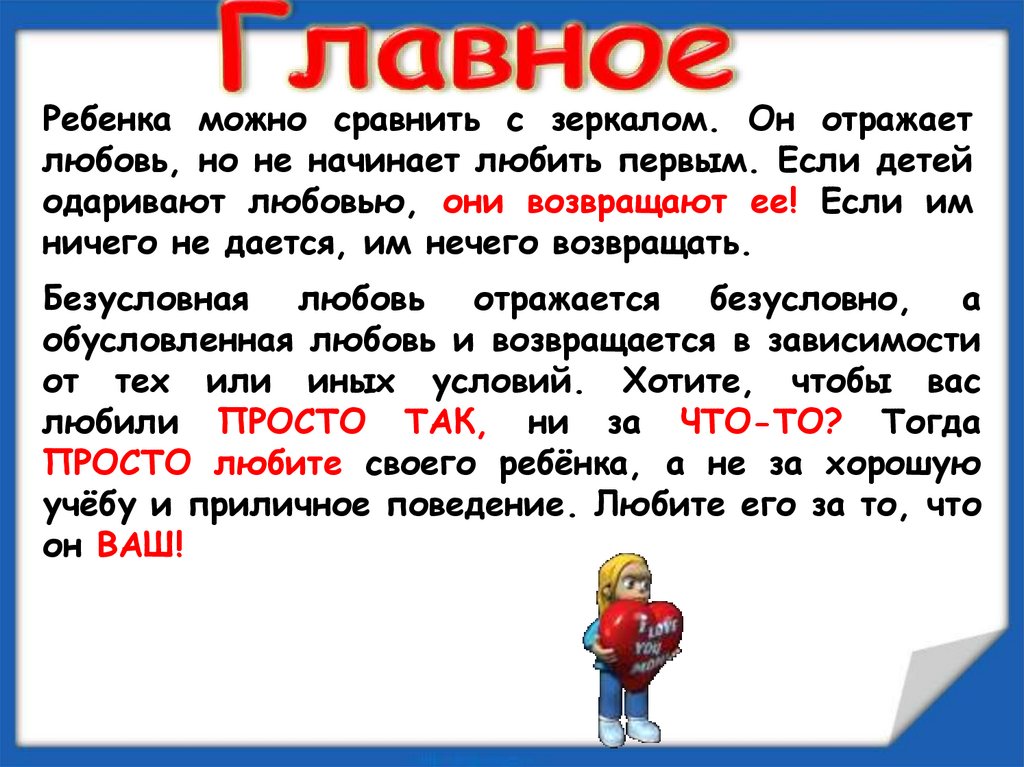 Ребенка можно сравнить с зеркалом. Он отражаетлюбовь, но не начинает любить первым. Если детей