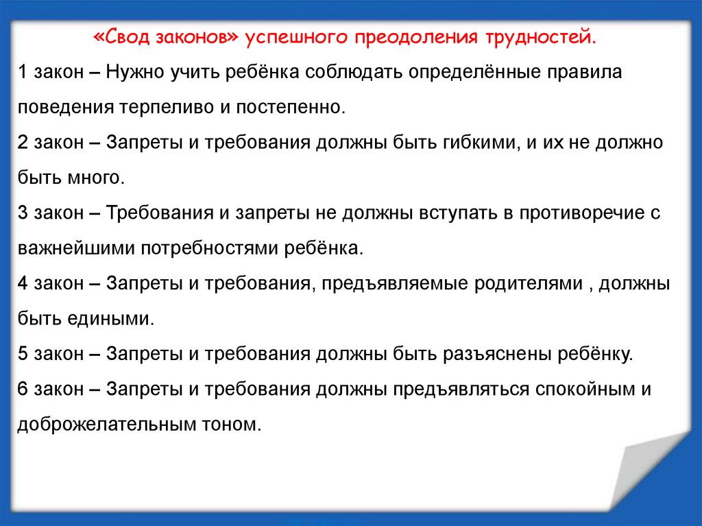 «Свод законов» успешного преодоления трудностей.1 закон – Нужно учить ребёнка соблюдать определённые правила