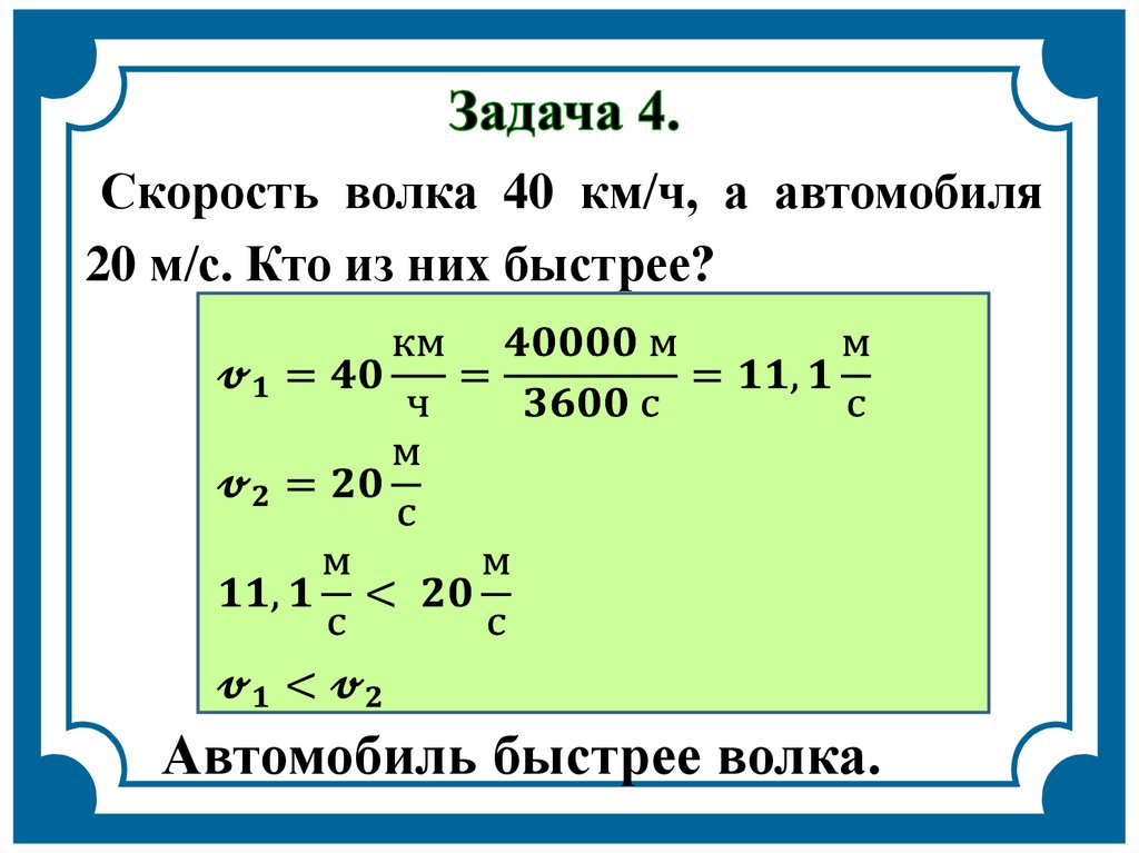 Скорость волка 40 км/ч, а автомобиля20 м/с. Кто из них быстрее?