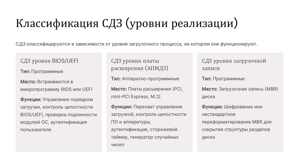 Классификация СДЗ (уровни реализации)СДЗ классифицируются в зависимости от уровня загрузочного процесса, на котором они функционируют.
