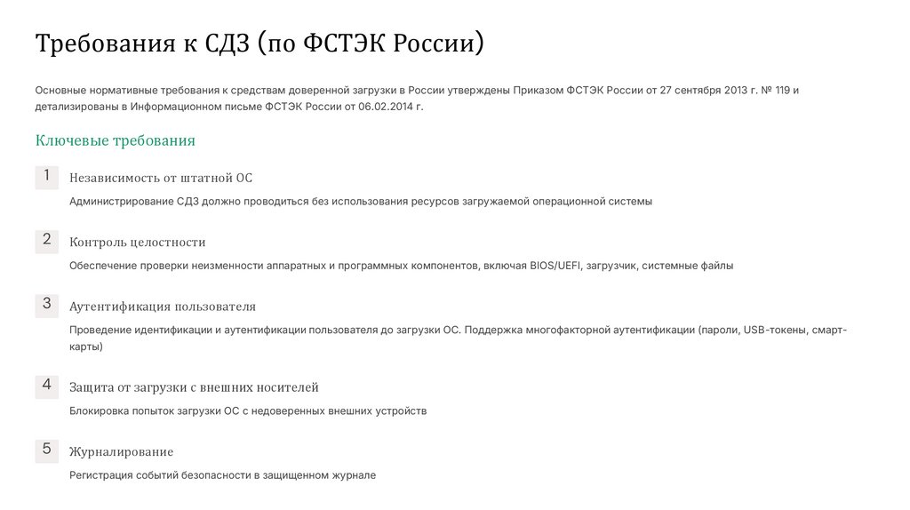 Требования к СДЗ (по ФСТЭК России)Основные нормативные требования к средствам доверенной загрузки в России утверждены Приказом ФСТЭК России от 27 сентября 2013 г. № 119 и
