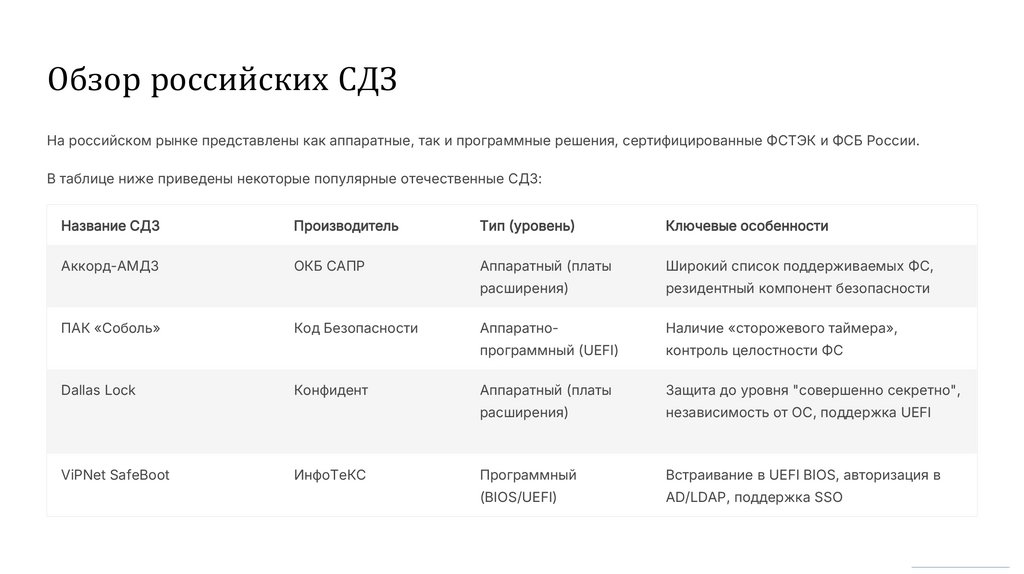 Обзор российских СДЗНа российском рынке представлены как аппаратные, так и программные решения, сертифицированные ФСТЭК и ФСБ России.