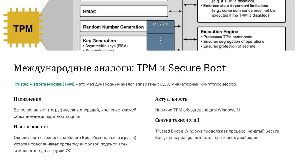 Международные аналоги: TPM и Secure BootTrusted Platform Module (TPM) – это международный аналог аппаратных СДЗ, миниатюрный криптопроцессор.