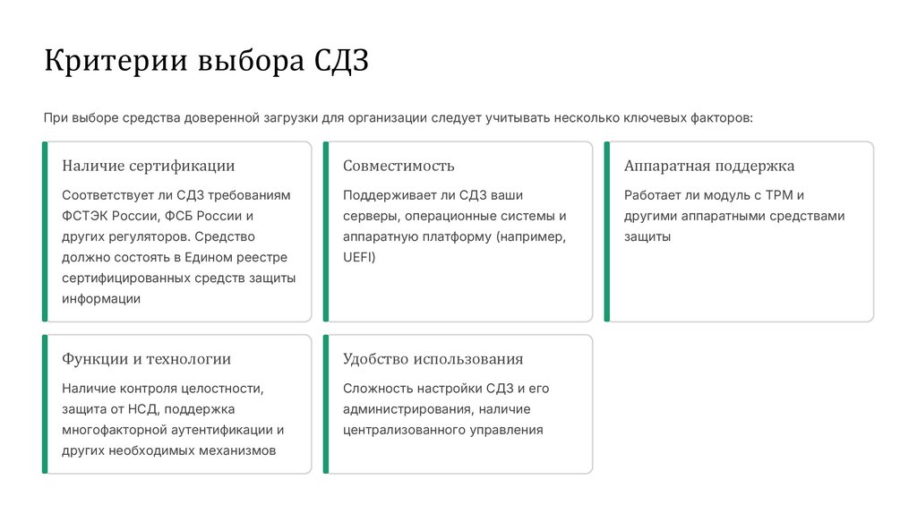 Критерии выбора СДЗПри выборе средства доверенной загрузки для организации следует учитывать несколько ключевых факторов: