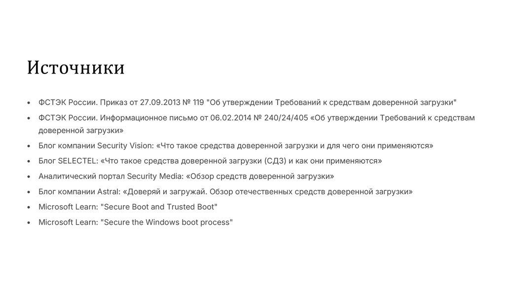 Источники• ФСТЭК России. Приказ от 27.09.2013 № 119 "Об утверждении Требований к средствам доверенной загрузки"
