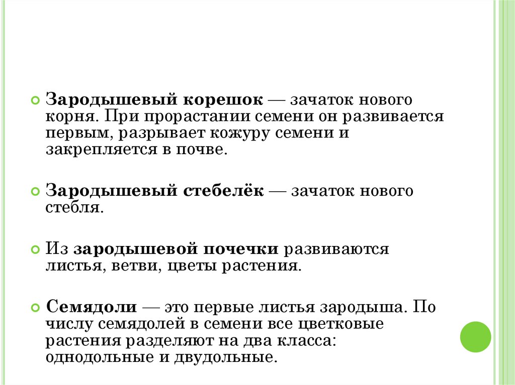 Зародышевый корешок — зачаток новогокорня. При прорастании семени он развивается