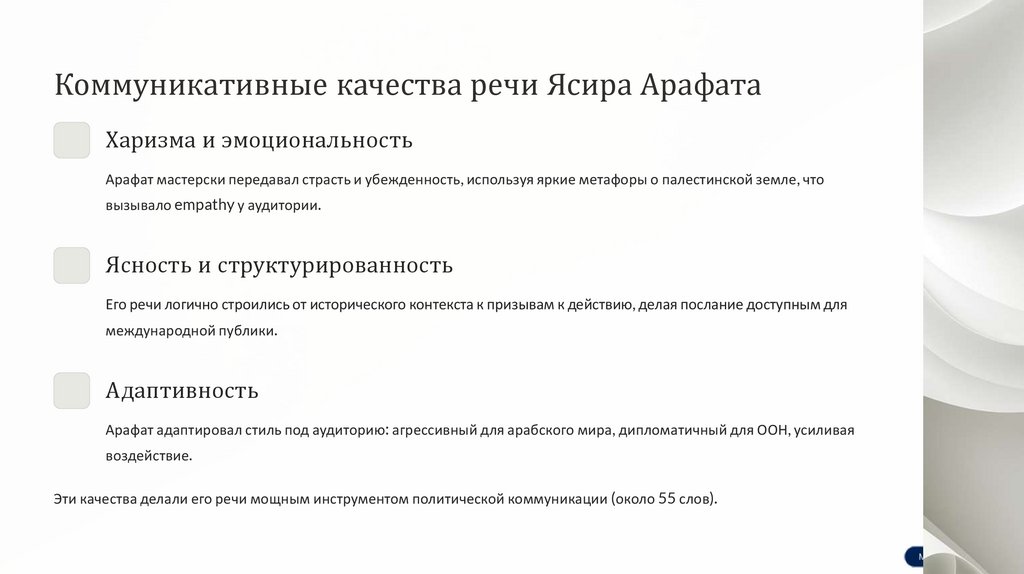 Эти качества делали его речи мощным инструментом политической коммуникации (около 55 слов).