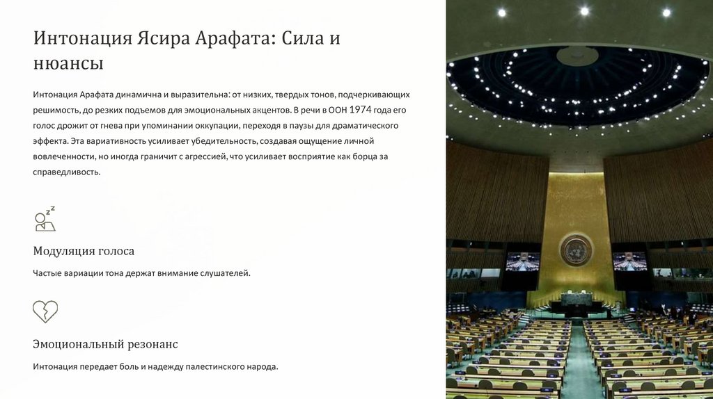 решимость, до резких подъемов для эмоциональных акцентов. В речи в ООН 1974 года его