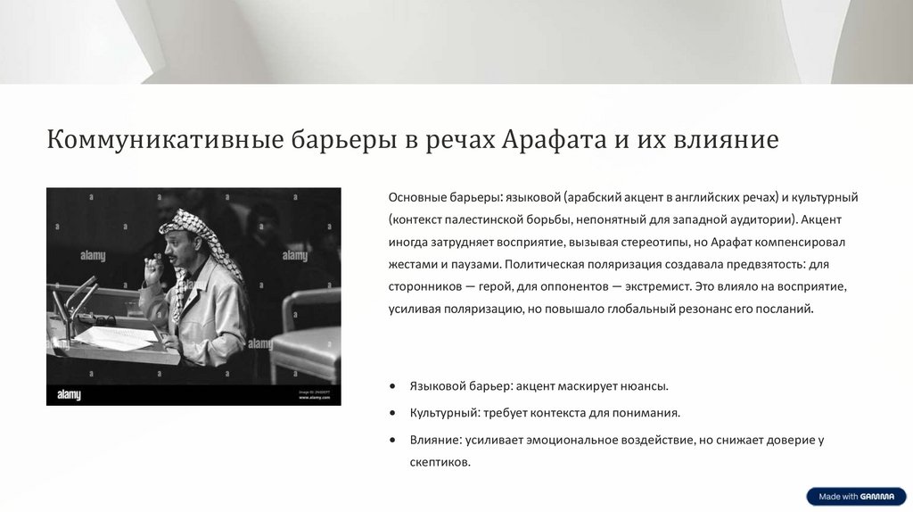 Коммуникативные барьеры в речах Арафата и их влияниеОсновные барьеры: языковой (арабский акцент в английских речах) и культурный