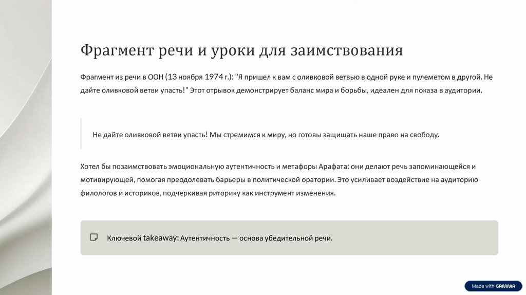 Фрагмент речи и уроки для заимствованияФрагмент из речи в ООН (13 ноября 1974 г.): "Я пришел к вам с оливковой ветвью в одной руке и пулеметом в другой. Не