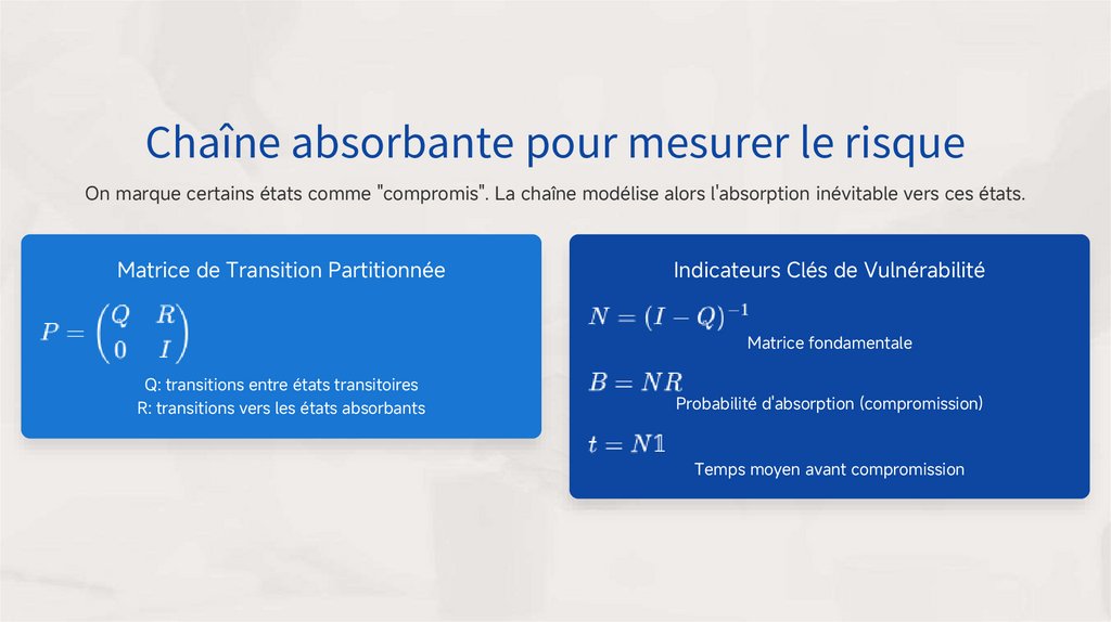 On marque certains états comme "compromis". La chaîne modélise alors l'absorption inévitable vers ces états.