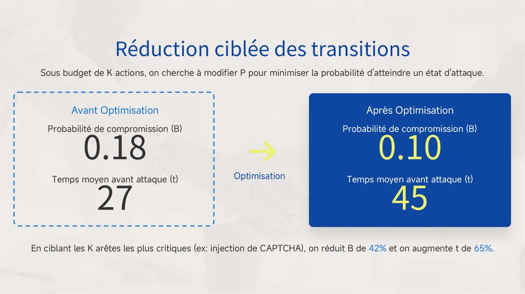 En ciblant les K arêtes les plus critiques (ex: injection de CAPTCHA), on réduit B de 42% et on augmente t de 65%.