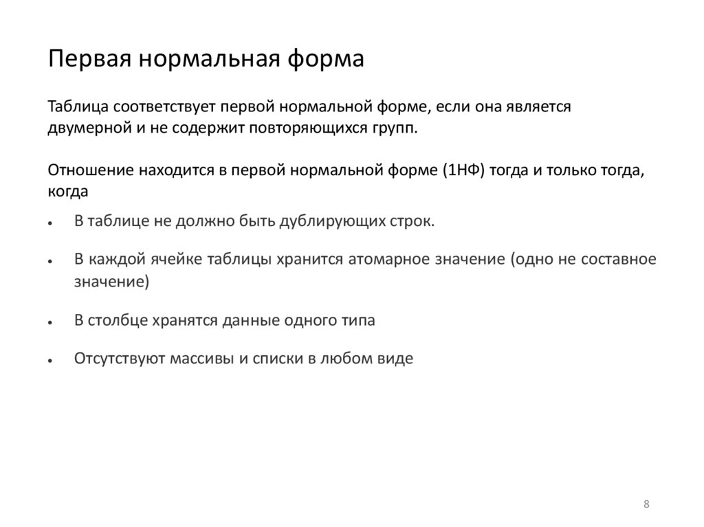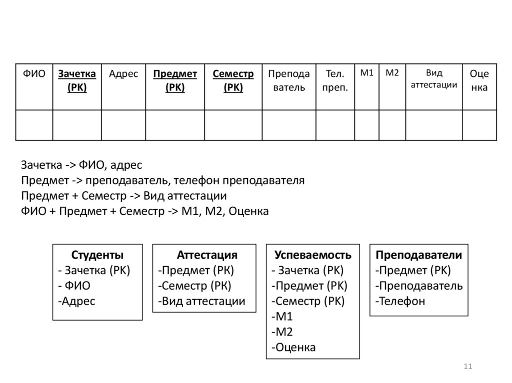 • отсутствуют транзитивные функциональные зависимости неключевых