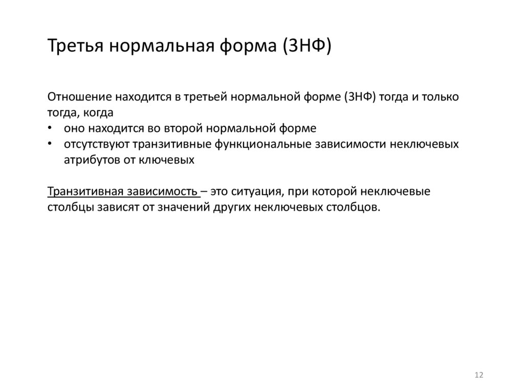 Третья нормальная форма (3НФ)Отношение находится в третьей нормальной форме (3НФ) тогда и только