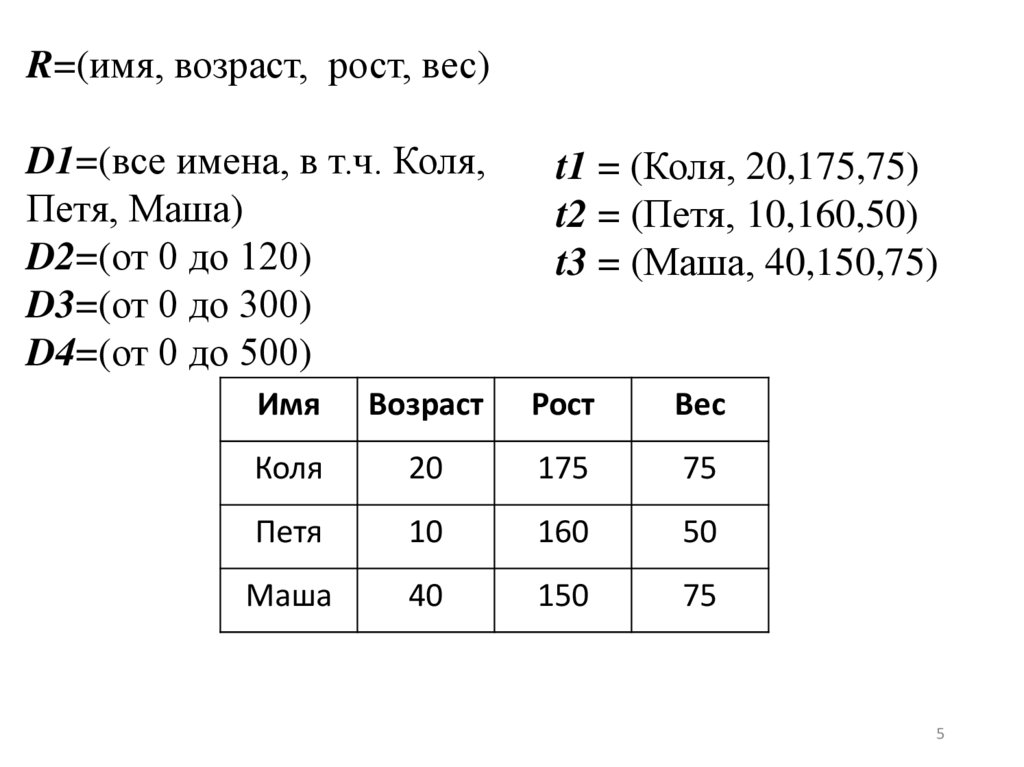 R=(имя, возраст, рост, вес)D1=(все имена, в т.ч. Коля,