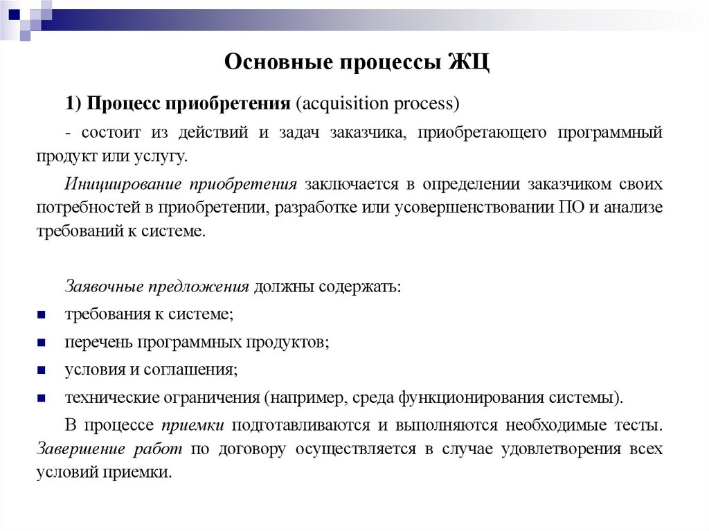 1) Процесс приобретения (acquisition process)- состоит из действий и задач заказчика, приобретающего программный