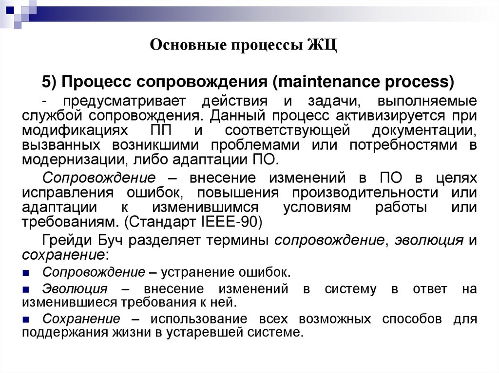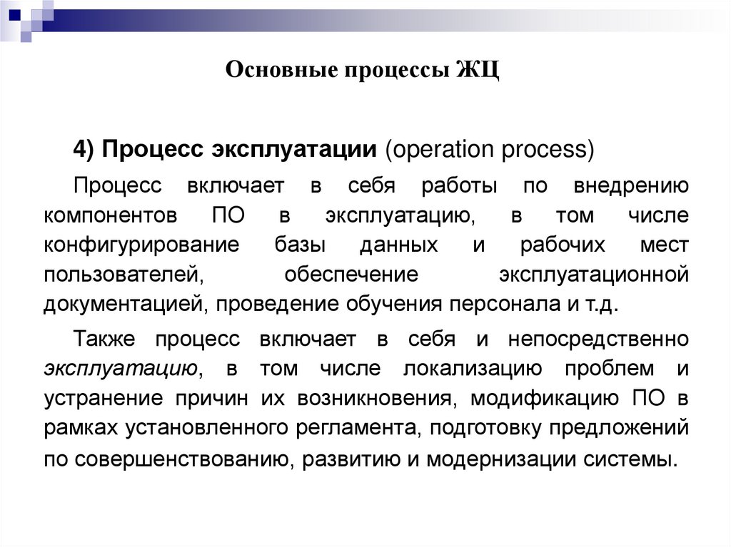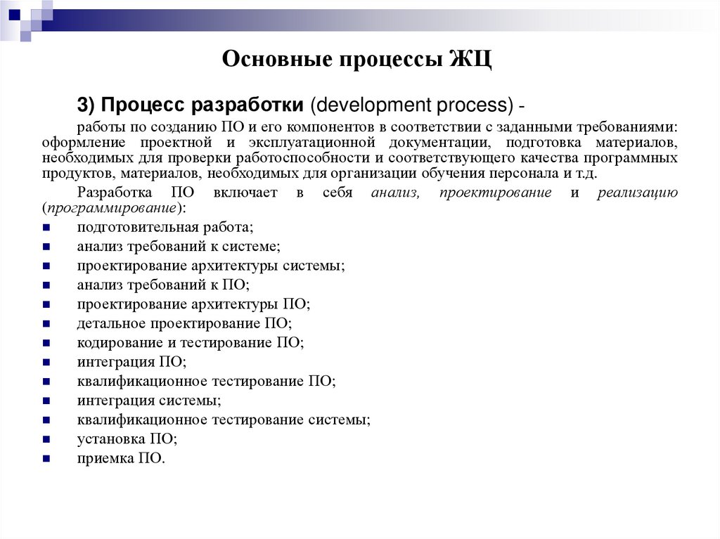 Основные процессы ЖЦ3) Процесс разработки (development process) работы по созданию ПО и его компонентов в соответствии с заданными требованиями: