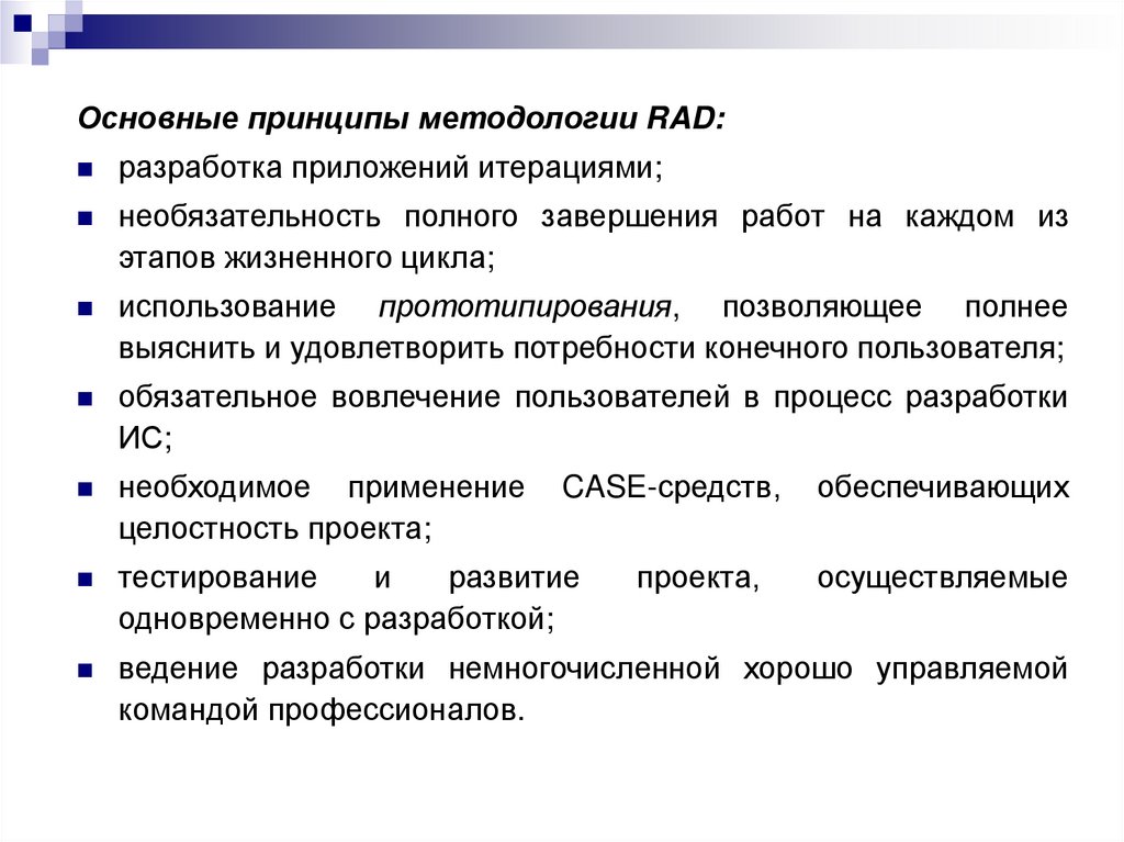 Основные принципы методологии RAD:разработка приложений итерациями;
