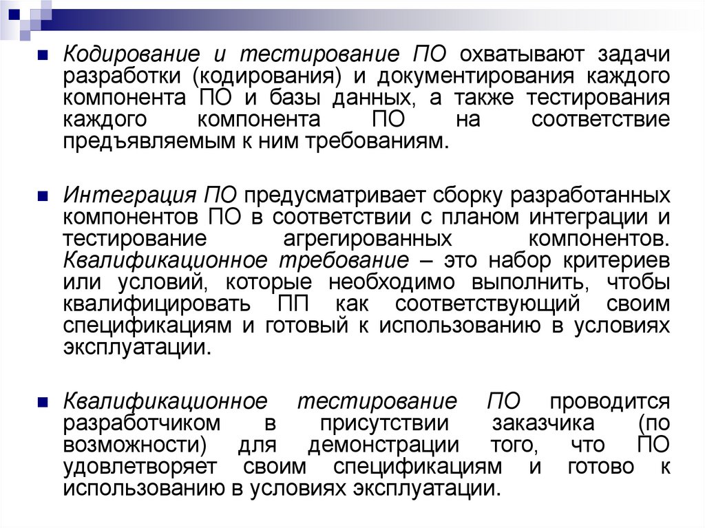 Кодирование и тестирование ПО охватывают задачиразработки (кодирования) и документирования каждого