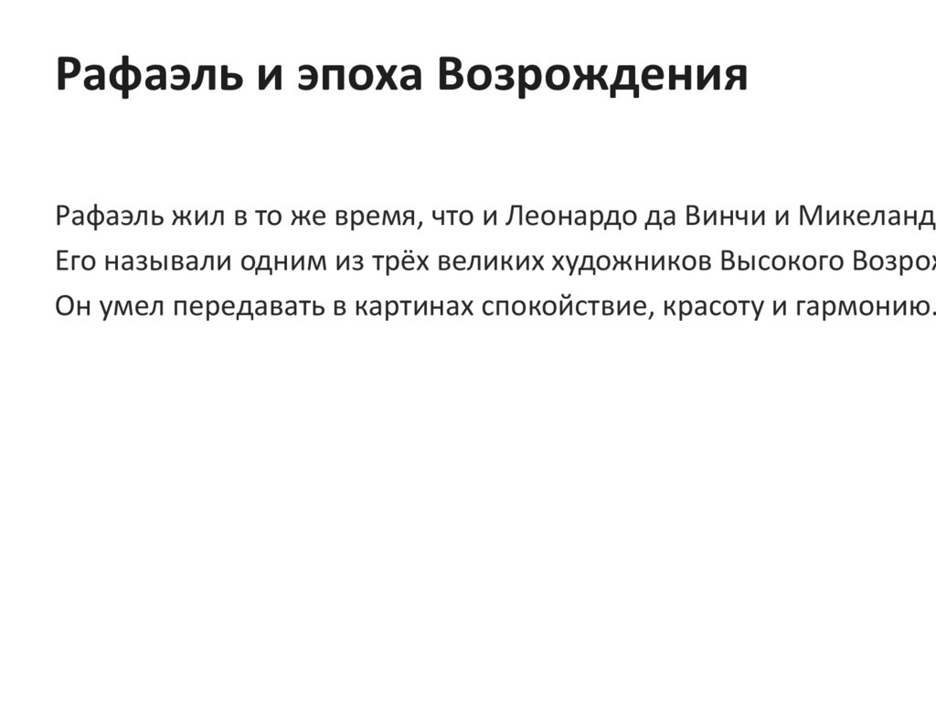 Рафаэль и эпоха ВозрожденияРафаэль жил в то же время, что и Леонардо да Винчи и Микеландж