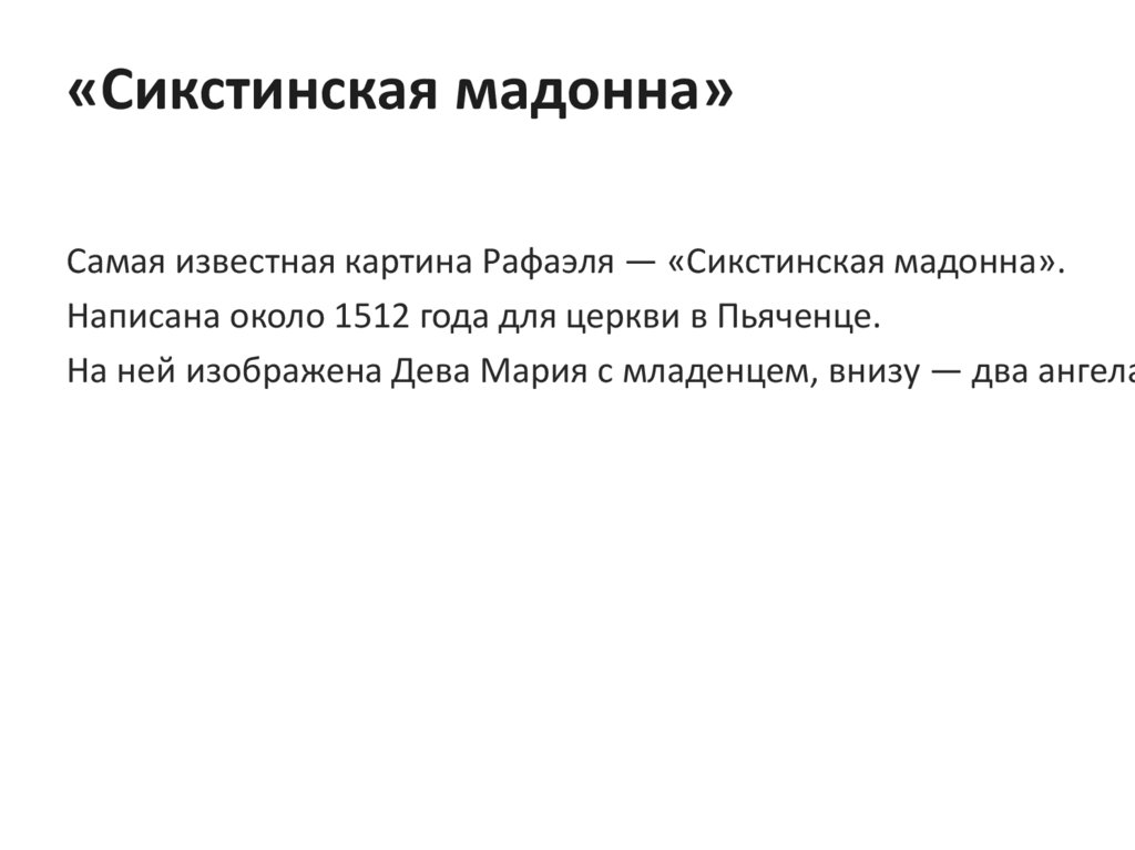 «Сикстинская мадонна»Самая известная картина Рафаэля — «Сикстинская мадонна».