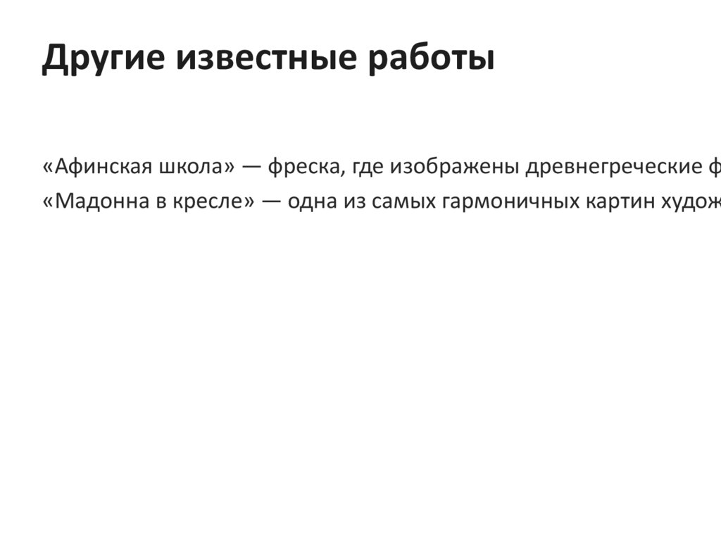 Другие известные работы«Афинская школа» — фреска, где изображены древнегреческие ф