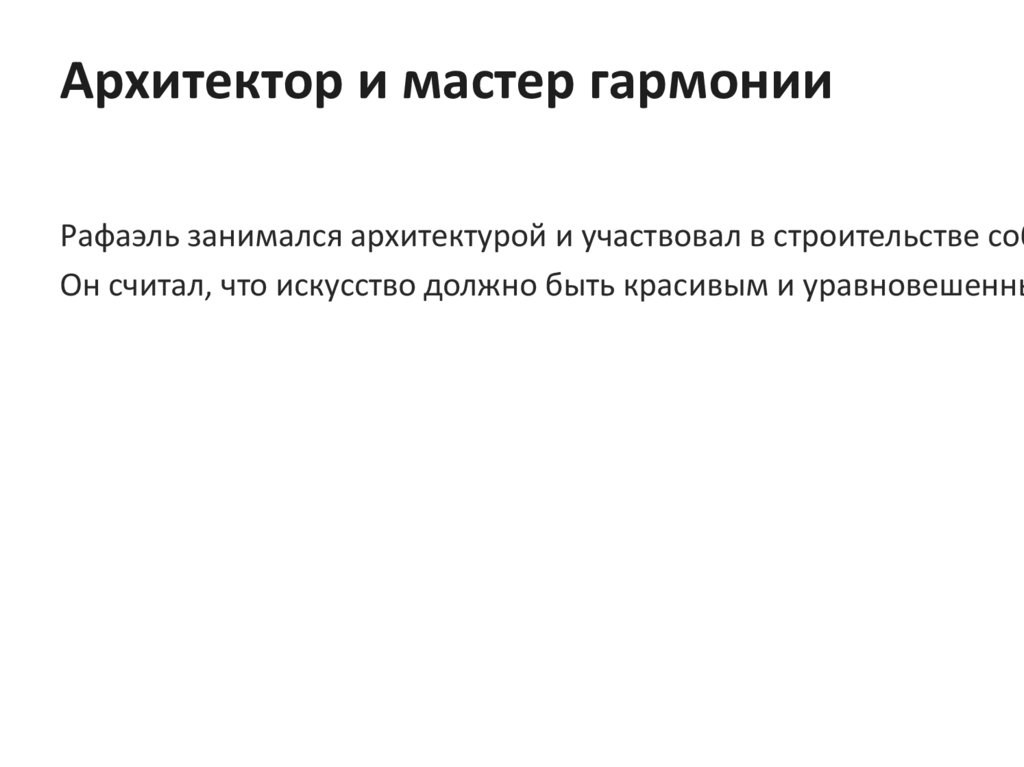 Архитектор и мастер гармонииРафаэль занимался архитектурой и участвовал в строительстве соб