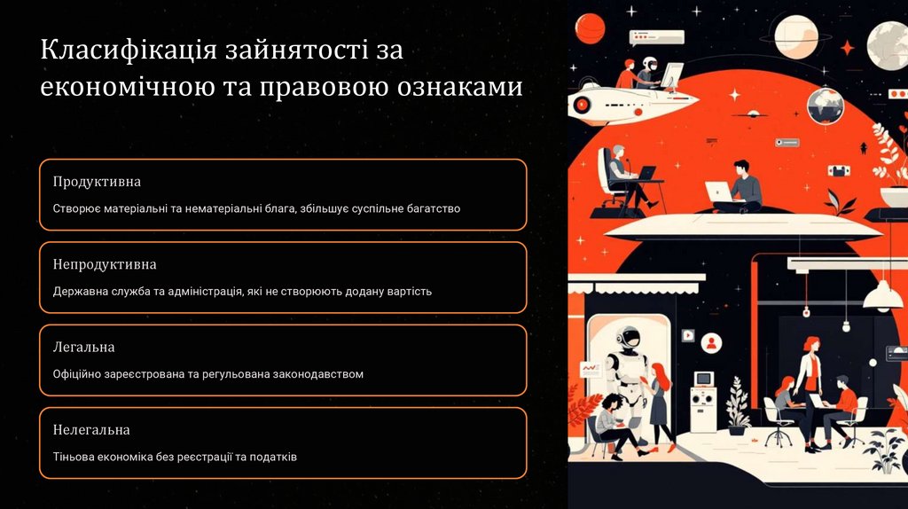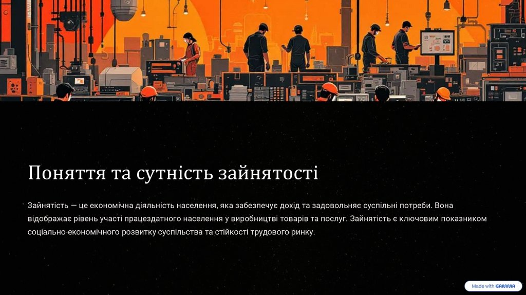 Поняття та сутність зайнятостіЗайнятість — це економічна діяльність населення, яка забезпечує дохід та задовольняє суспільні потреби. Вона