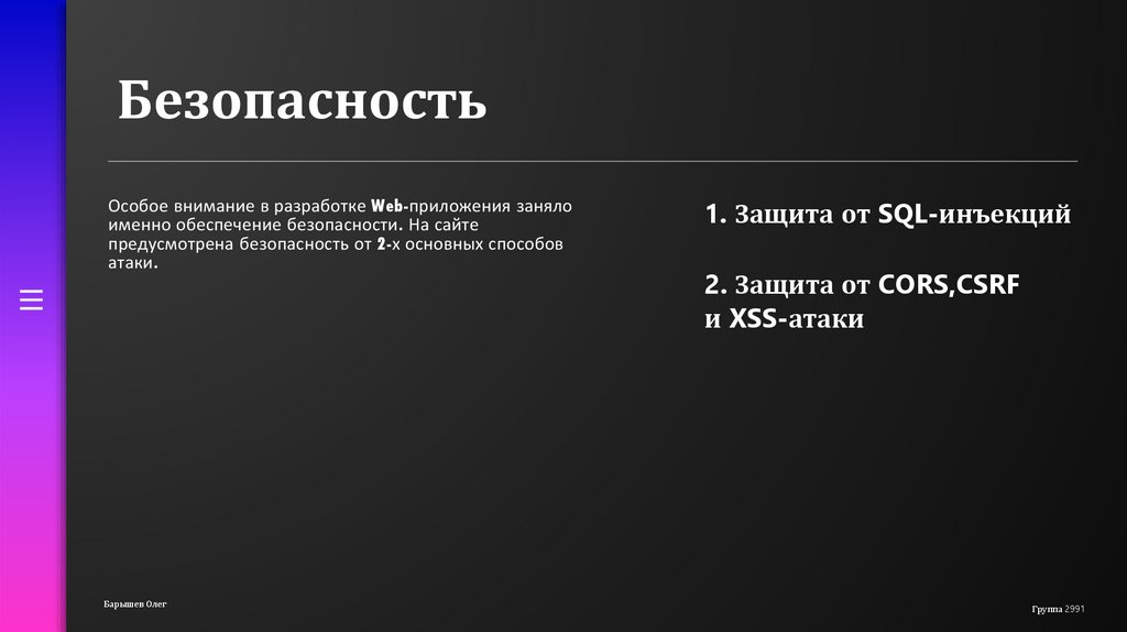 БезопасностьОсобое внимание в разработке Web-приложения заняло