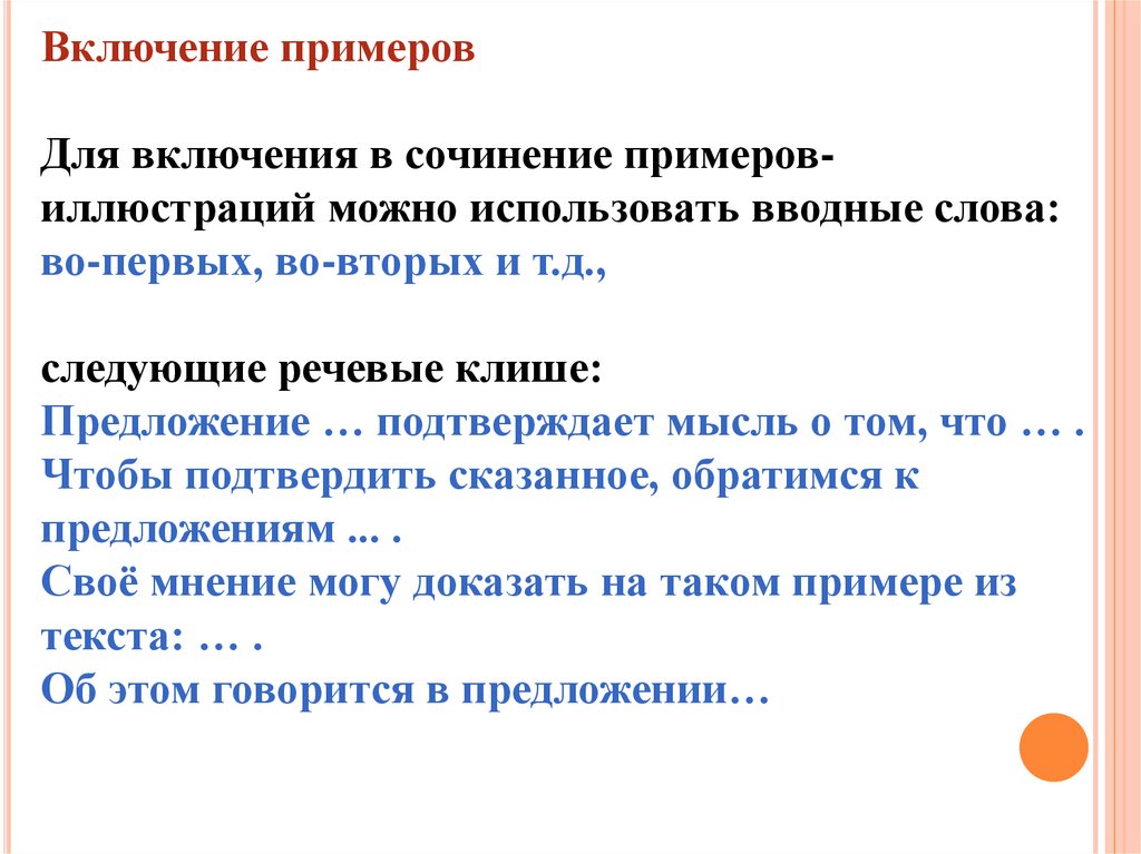Включение примеровДля включения в сочинение примеровиллюстраций можно использовать вводные слова:
