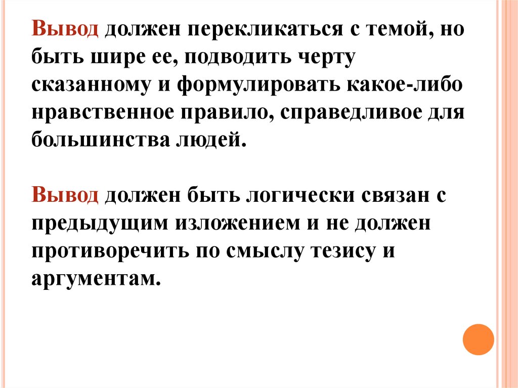 Вывод должен перекликаться с темой, нобыть шире ее, подводить черту