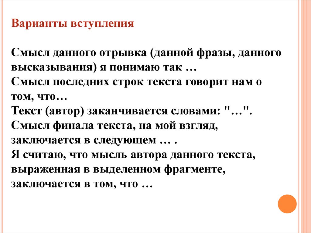 Варианты вступленияСмысл данного отрывка (данной фразы, данного