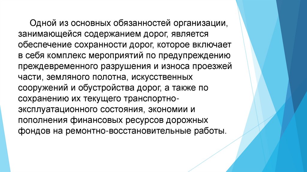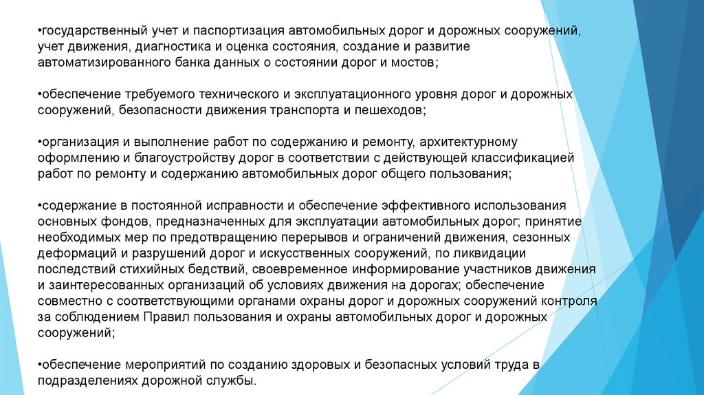 •обеспечение требуемого технического и эксплуатационного уровня дорог и дорожных