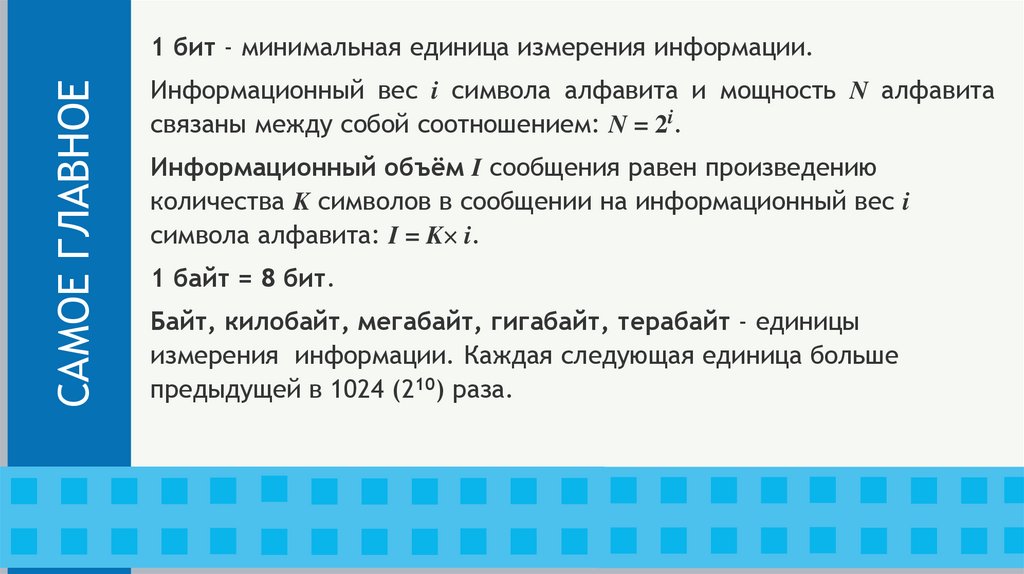 САМОЕ ГЛАВНОЕ1 бит - минимальная единица измерения информации.