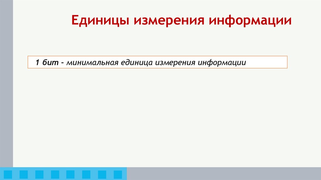 Единицы измерения информации1 бит – минимальная единица измерения информации