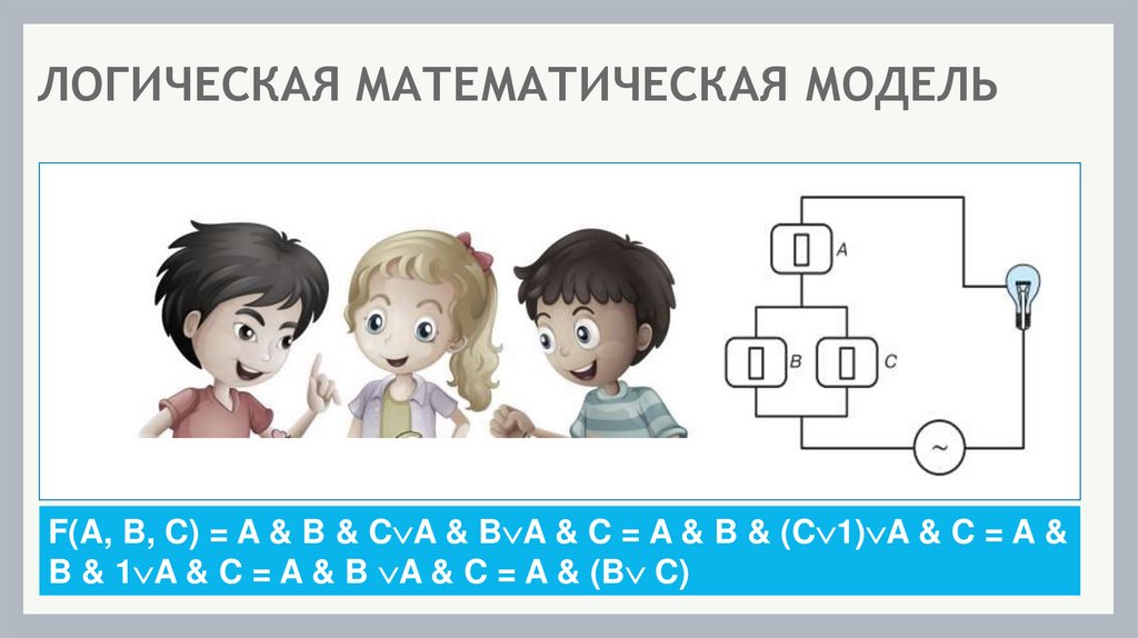 ЛОГИЧЕСКАЯ МАТЕМАТИЧЕСКАЯ МОДЕЛЬF(A, B, C) = A & B & C A & B A & C = A & B & (C 1) A & C = A &