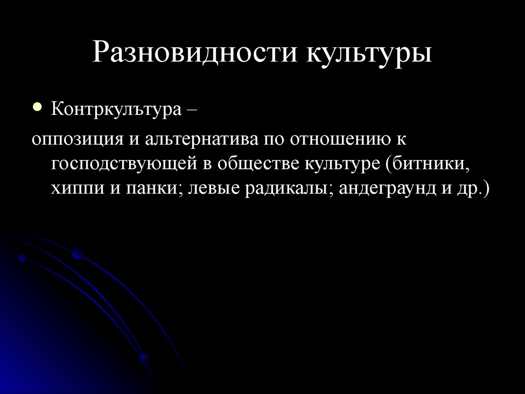 хиппи и панки; левые радикалы; андеграунд и др.)