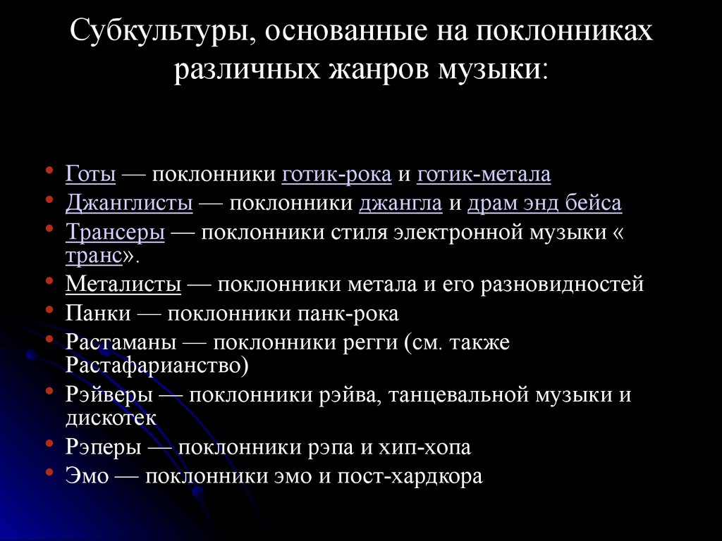 Субкультуры, основанные на поклонникахразличных жанров музыки: