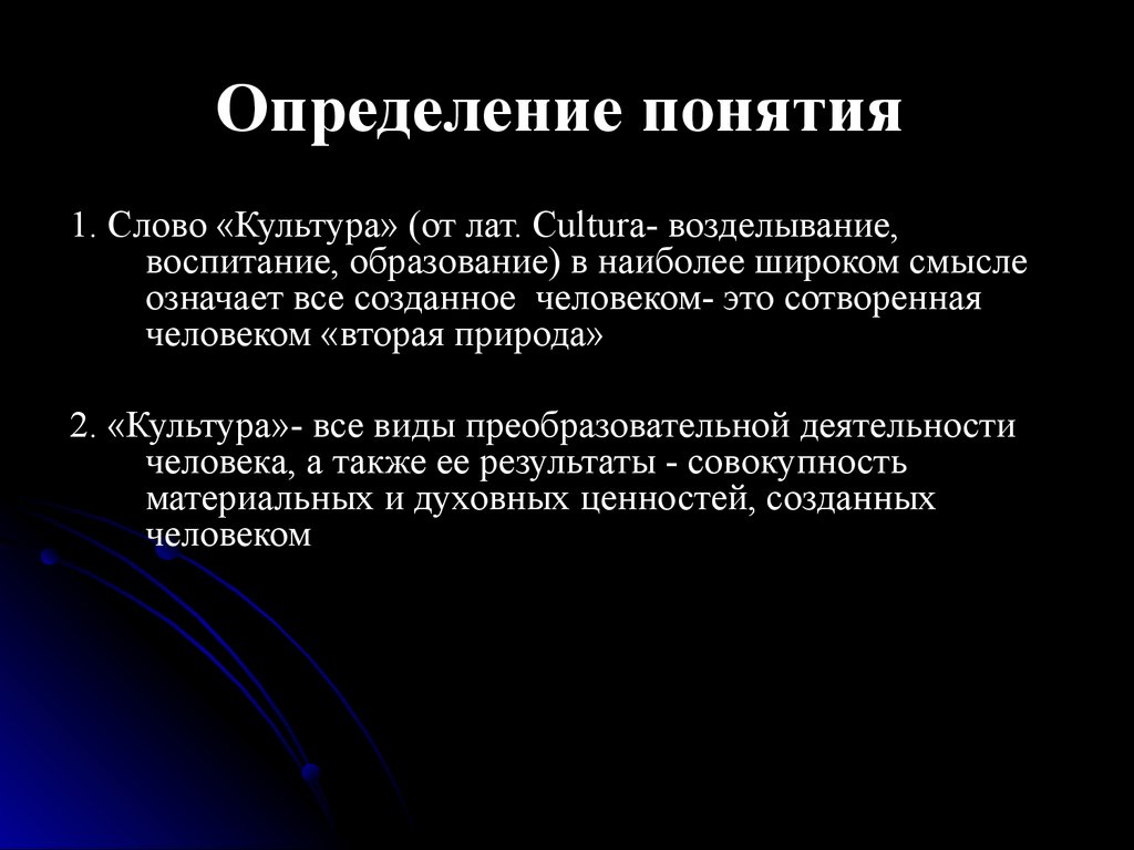 Определение понятия1. Слово «Культура» (от лат. Cultura- возделывание,