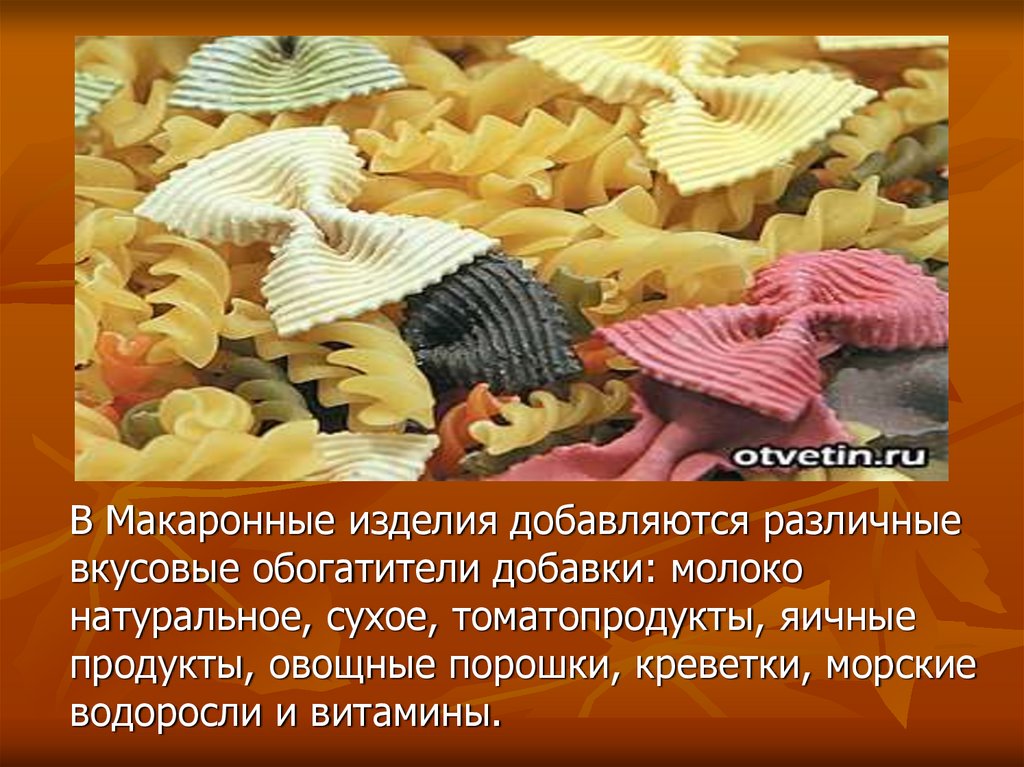 В Макаронные изделия добавляются различныевкусовые обогатители добавки: молоко