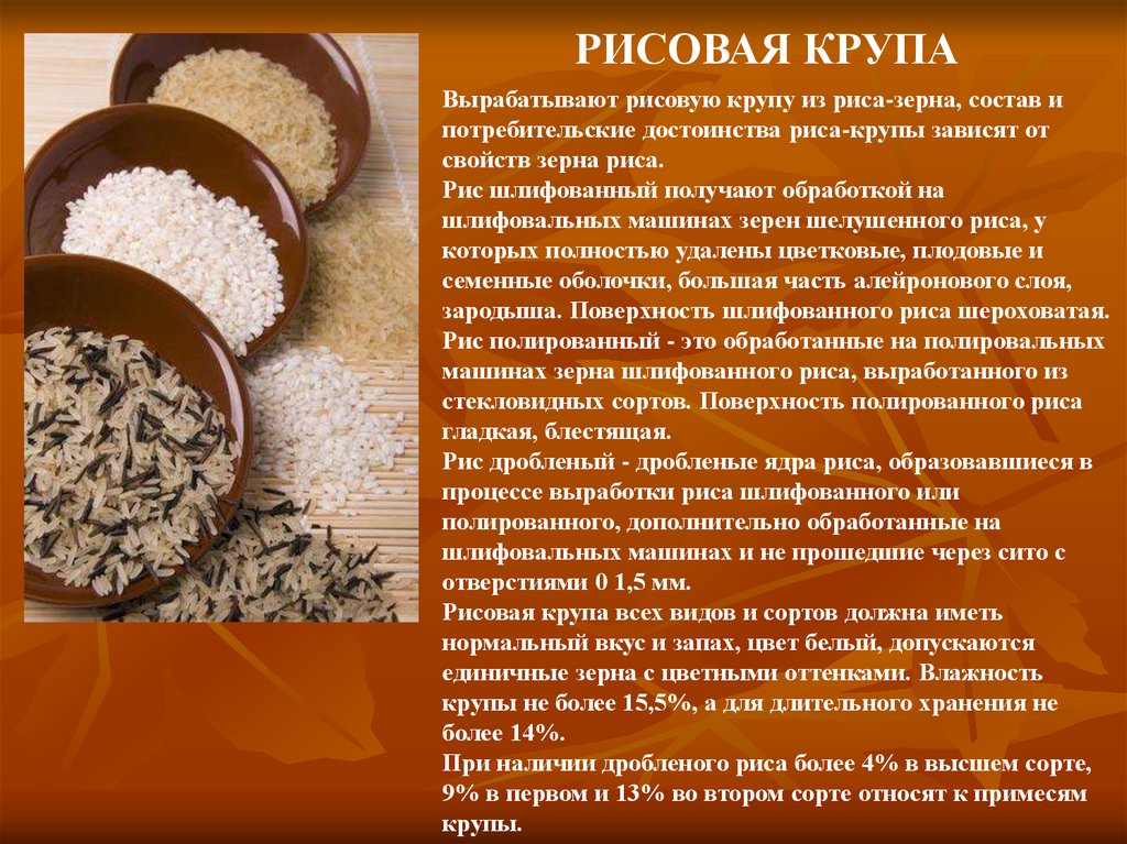 РИСОВАЯ КРУПАВырабатывают рисовую крупу из риса-зерна, состав и