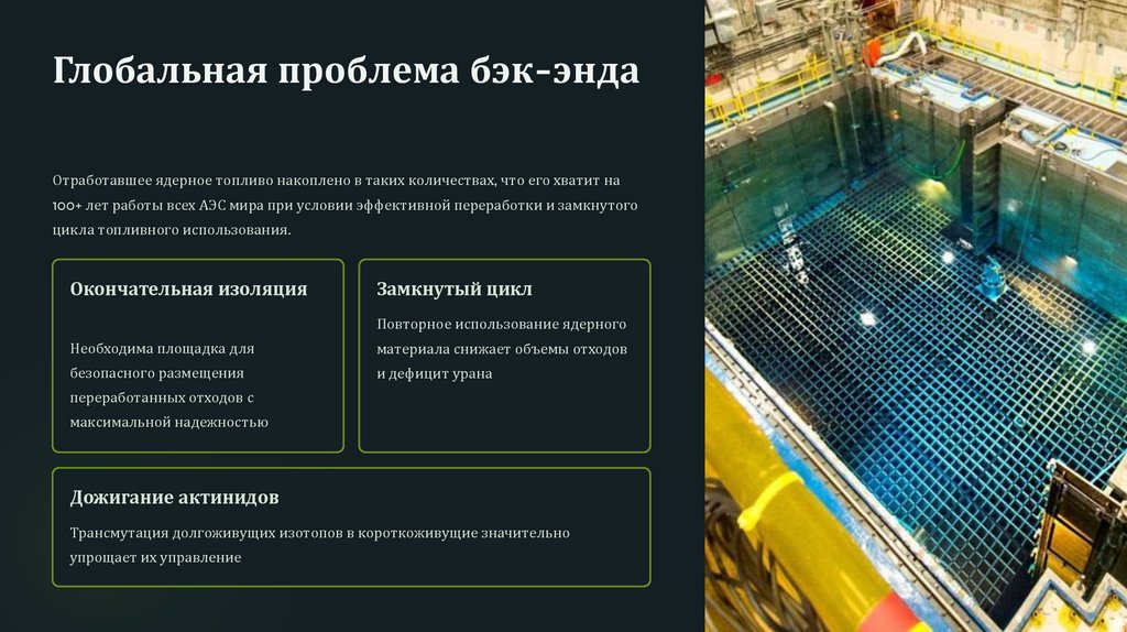 Глобальная проблема бэк-эндаОтработавшее ядерное топливо накоплено в таких количествах, что его хватит на