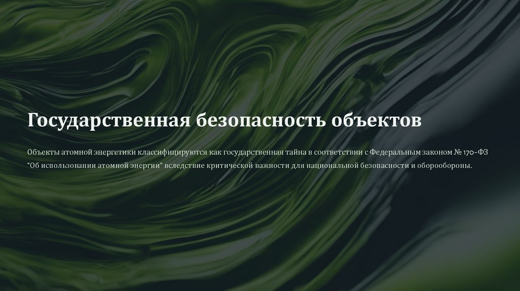 Государственная безопасность объектовОбъекты атомной энергетики классифицируются как государственная тайна в соответствии с Федеральным законом № 170-ФЗ