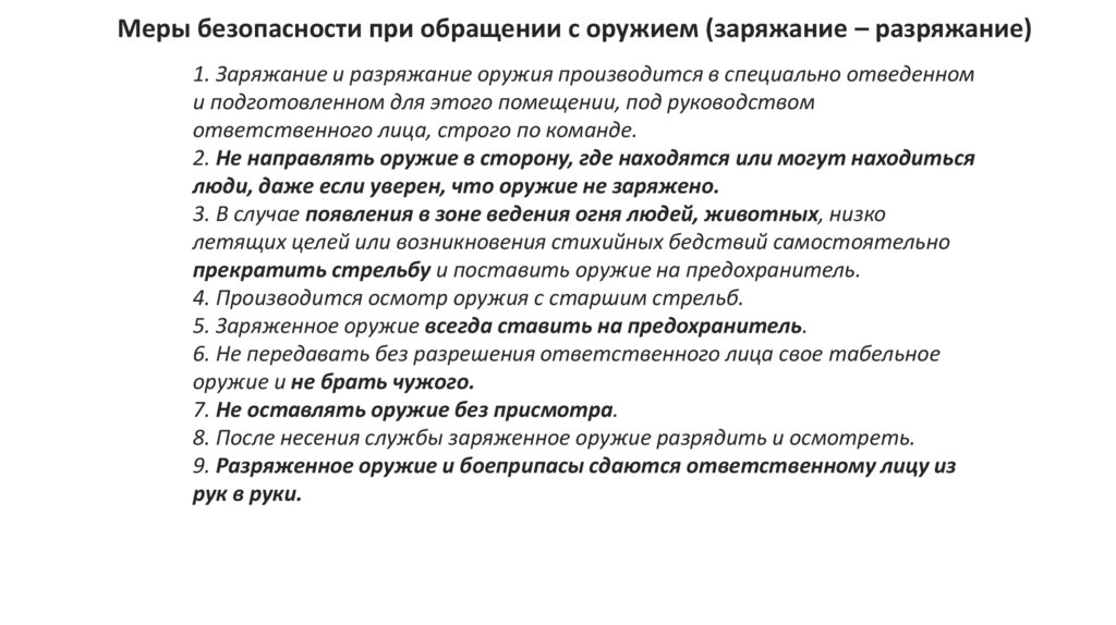 Меры безопасности при обращении с оружием (заряжание – разряжание)1. Заряжание и разряжание оружия производится в специально отведенном
